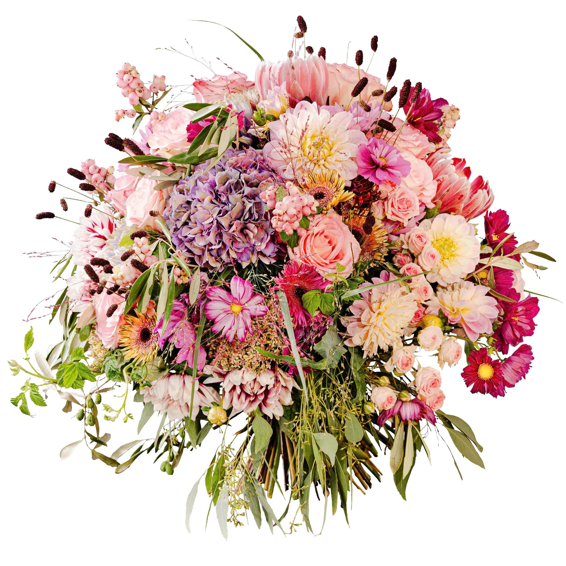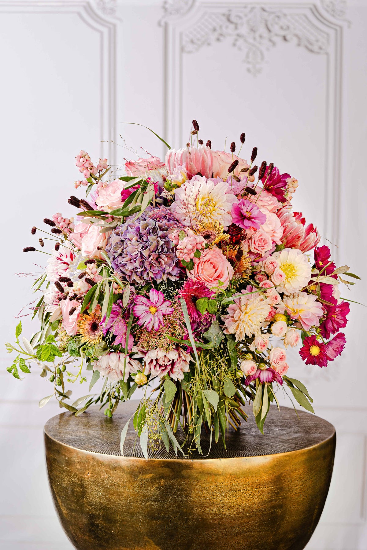 Dieser opulente Strauß spielt mit seiner großen Vielfalt an Farbe und Blumen. Eine solche üppige Pracht können nur unsere Floristenhände gesalten - handarbeit von Blumen Bahlmann Muenchen
