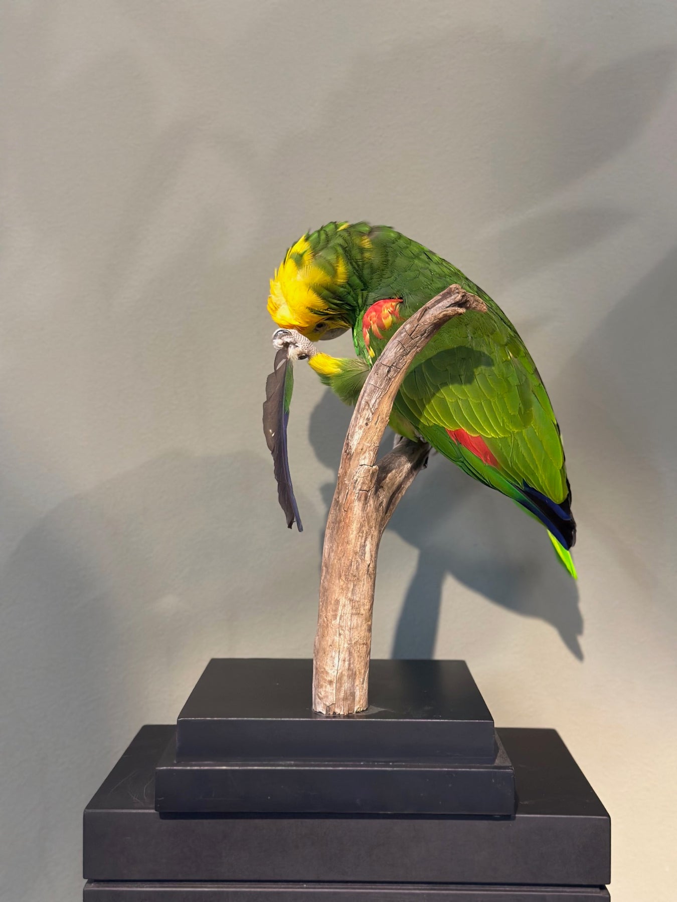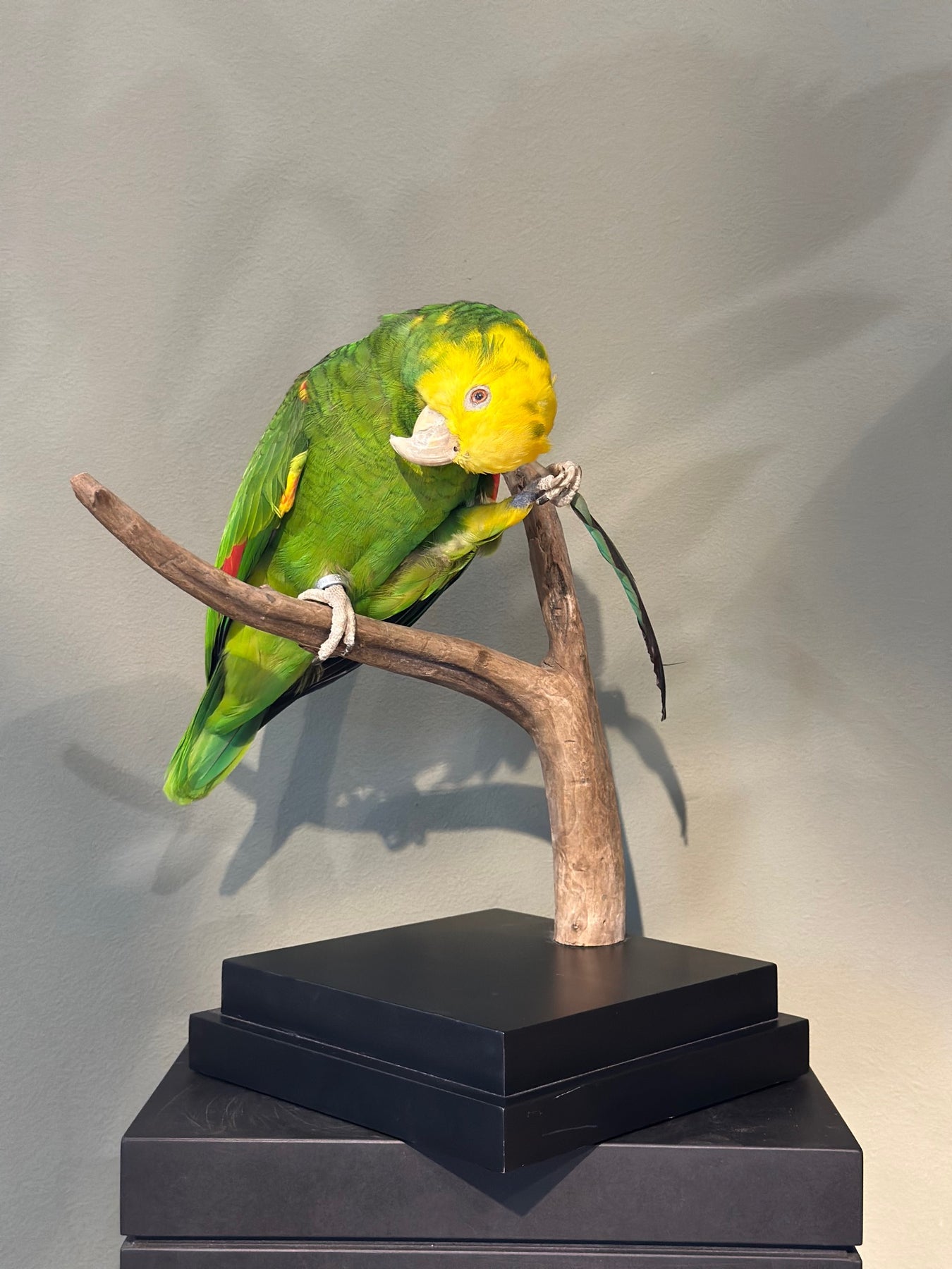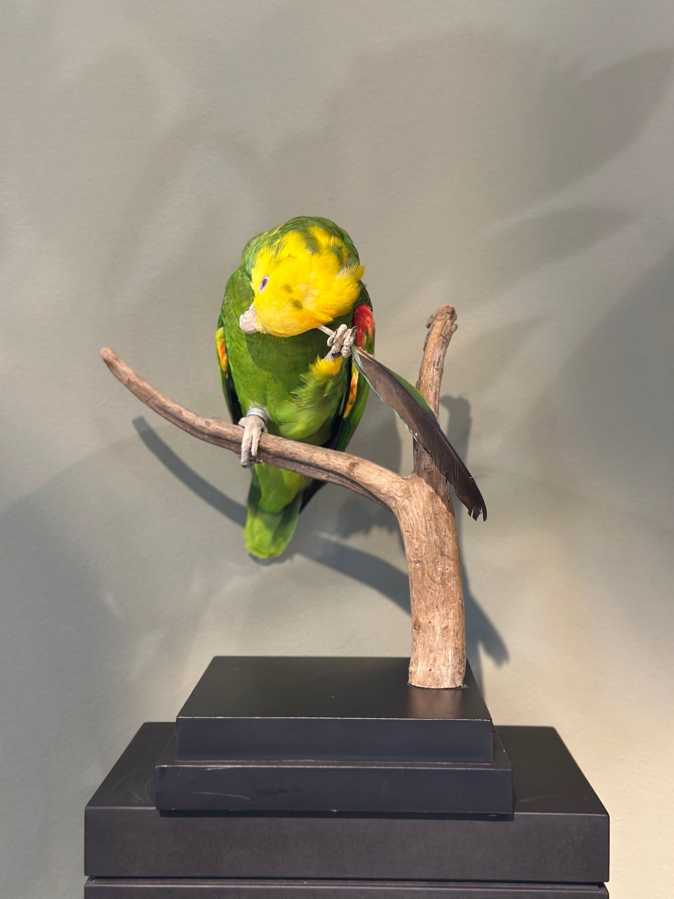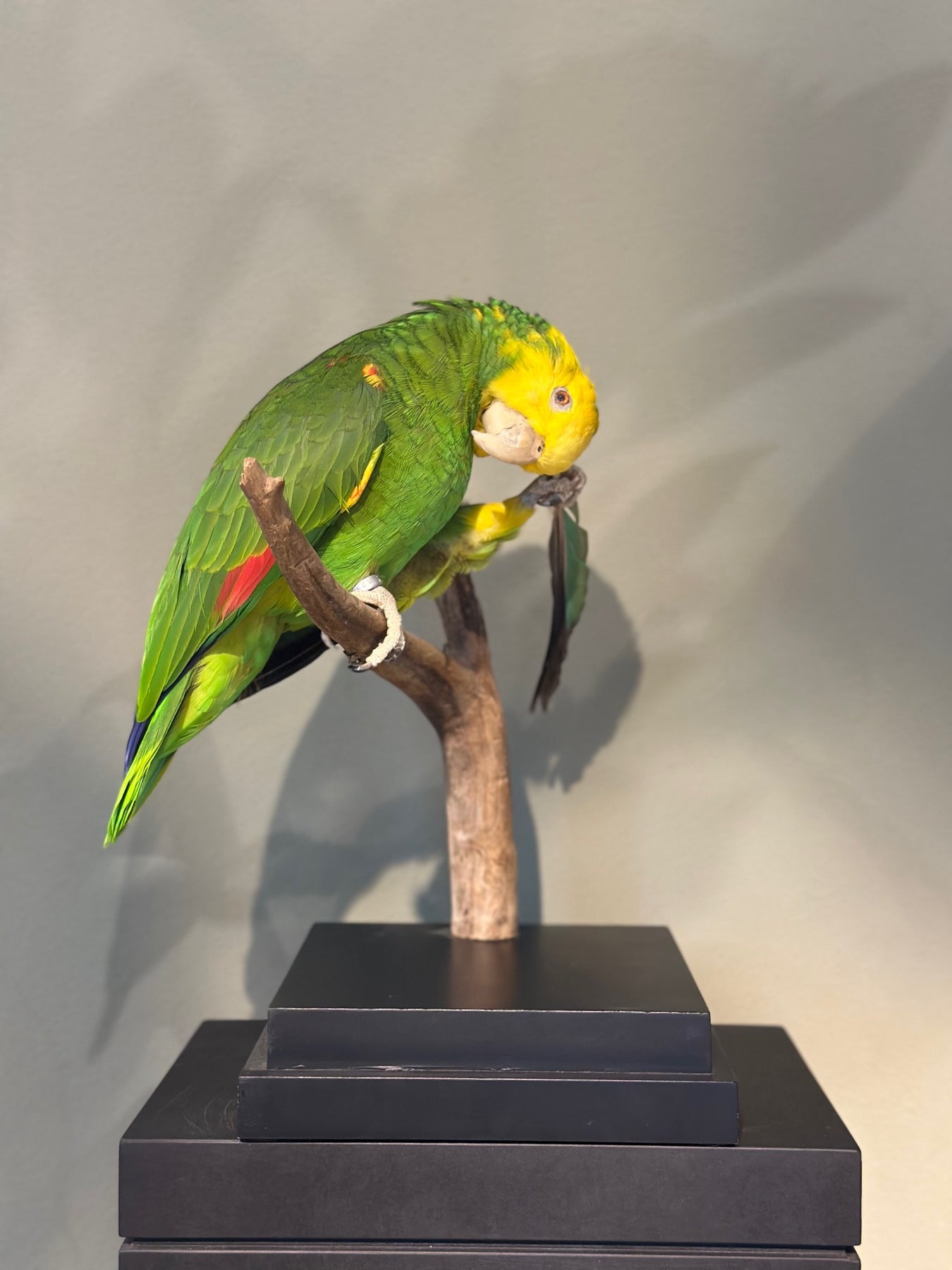 Der Gelbkopfpapagei ist eine der auffälligsten und bekanntesten Vertreter der Gattung Amazona, die ursprünglich aus Mittelamerika stammt. Sein leuchtend gelbes Kopfgefieder hebt sich schön vom satten Grün seines Körpers ab. Diese intelligenten und sozialen Vögel sind für ihre laute Stimme und hohe Lernfähigkeit bekannt, was sie weltweit beliebt macht. Es ist perfekt geeignet für naturkundliche Sammlungen, museale Ausstellungen oder als einzigartiges Dekorationsstück mit Charakter.