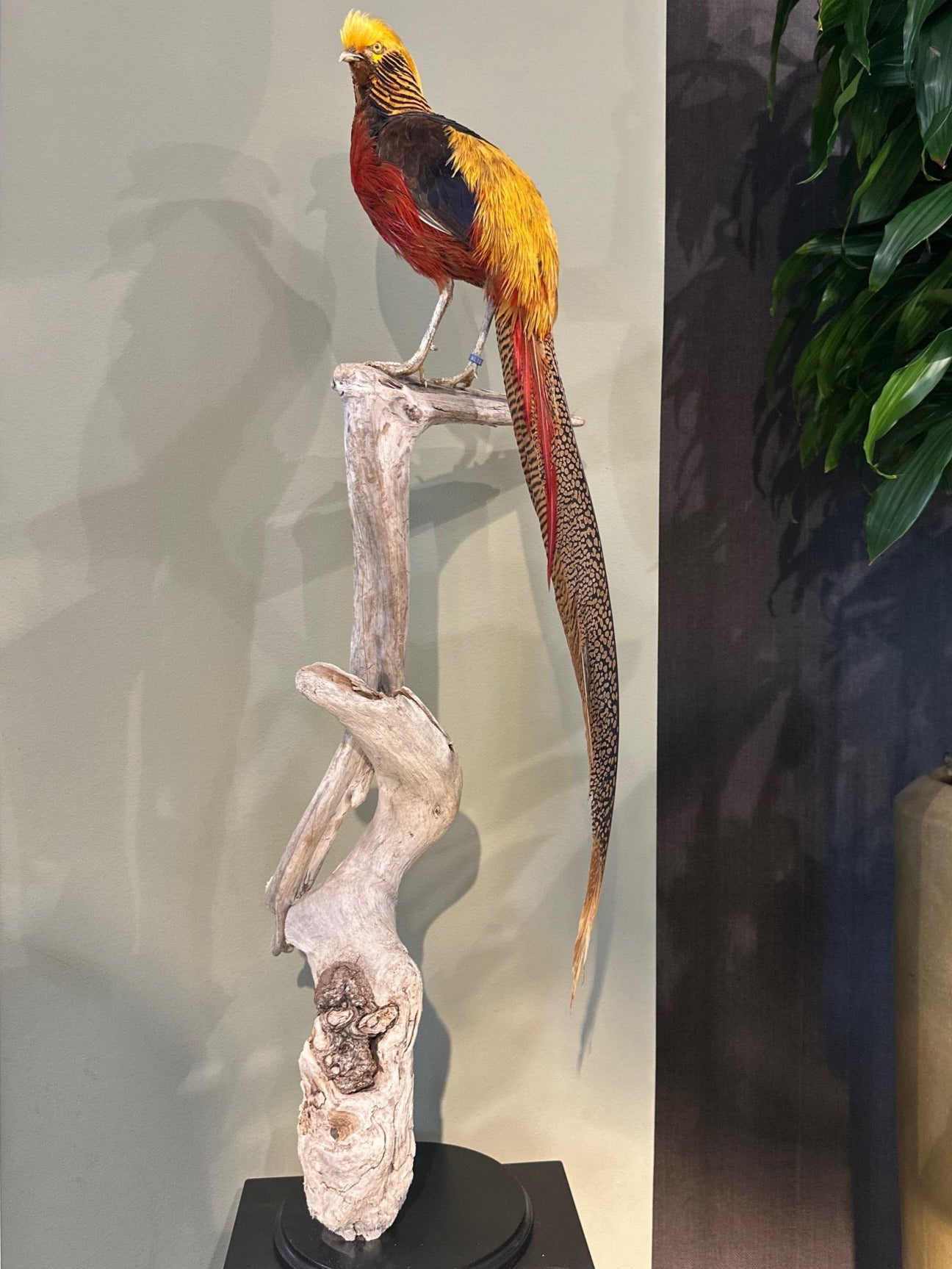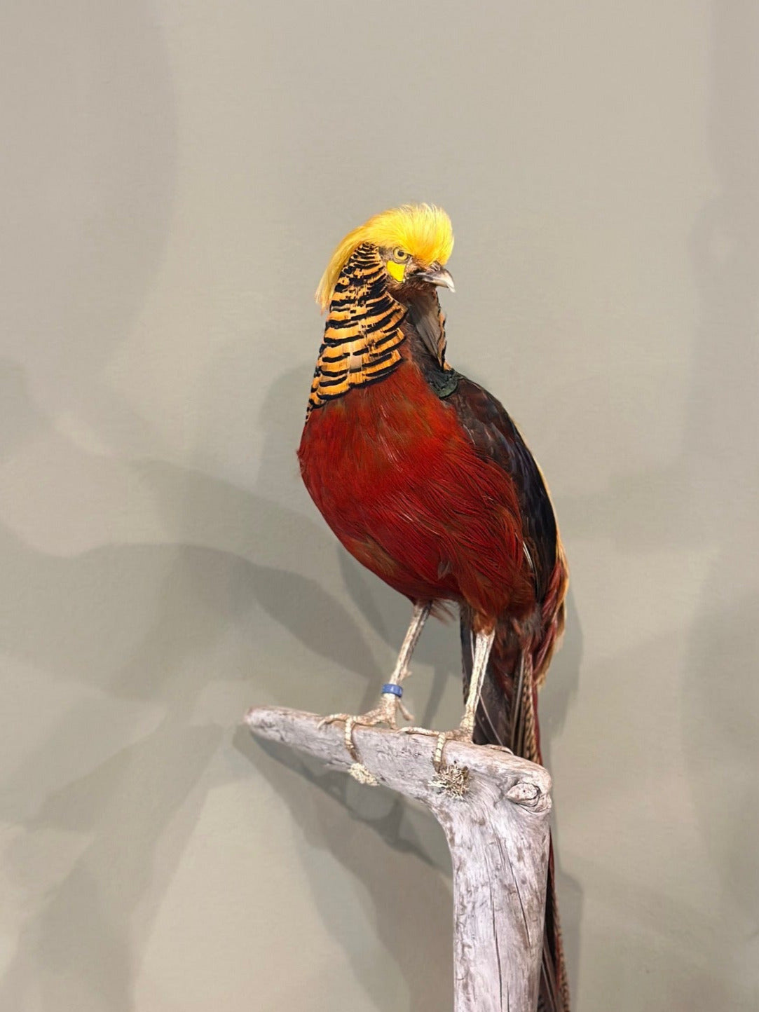 Präparierter Goldfasan mit leuchtend rotem Körper, goldgelbem Schopf und langem, fein gemustertem Schwanz – dekoratives Exemplar mit exotischer Ausstrahlung. Blumen Bahlmann München